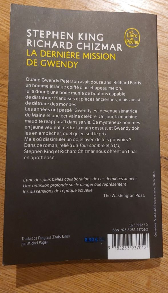 Quand Gwendy Peterson avait douze ans, Richard Farris, un homme étrange avec un chapeau melon lui a donné une boîte munie de boutons qui permettait de distribuer friandises et pièces anciennes, mais qui pouvait aussi détruire des mondes. Les années ont passé, Gwendy est devenue sénatrice du Maine et une écrivaine célèbre. Un jour la boîte réapparait dans sa vie. Les mystérieux hommes en jaune veulent mettre la main sur l’objet maudit, et Gwendy doit les en empêcher, quel qu’en soit le prix. Mais où dissimuler un objet avec de tels pouvoirs ? Avec ce roman, relié à La Tour sombre et Ça, Stephen King et Richard Chizmar nous offrent un final en apothéose.